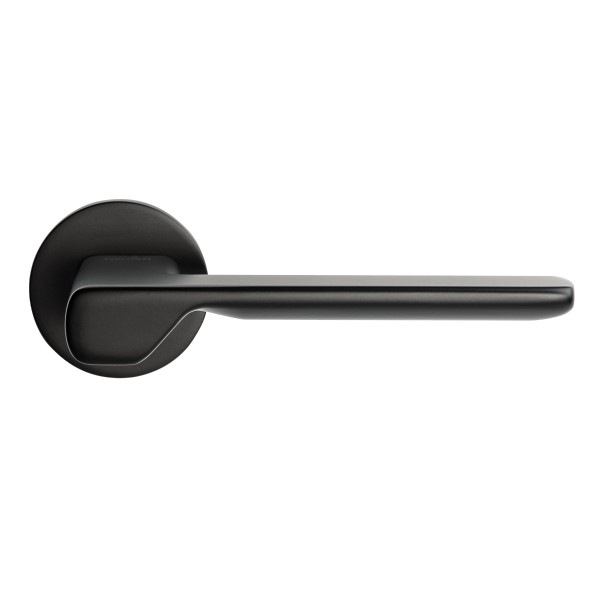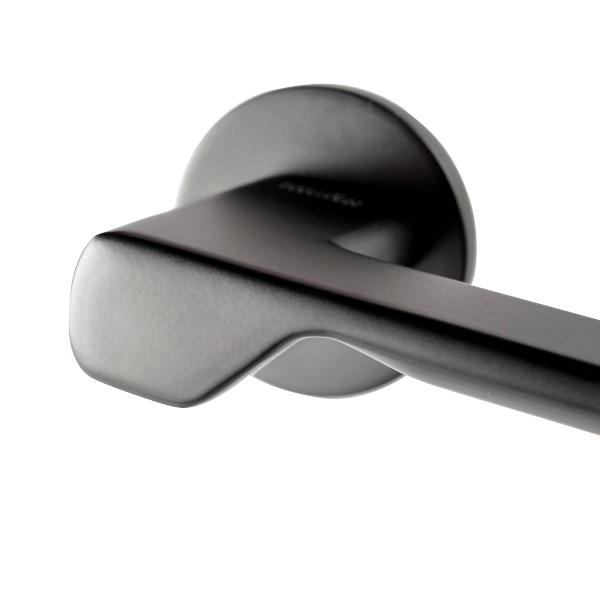 Данная модель выполнена в черном трендовом цвете. Выглядеть дорого и премиально в современном модерновом интерьере на дверях как светлых, так и темных оттенков. Особенностью этой модели является тонкая круглая розета, благодаря которой ручки на холсте будут максимально элегантными.