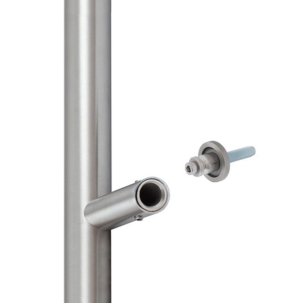 Ручка скоба чешского производства ROSTEX. Идеальный выбор для интерьера в современном стиле. Чтобы открыть дверь достаточно просто потянуть за скобу. Такие ручки прекрасно подойдут для помещений с большим трафиком людей, например, в офис, магазин, кафе или ресторан. Из-за отсутствия пружинного механизма срок эксплуатации в несколько раз больше, чем в фурнитуры нажимного типа. Основным техническим критерием при выборе является длина ручки и расстояние между креплениями. Важно чтобы при установлении скобы, крепления разместились выше и ниже замка. Через дверное полотно делается сквозное отверстие, куда вставляется специальная шпилька с резьбой. На нее накручивается ручка и фиксируется гужонами на нижней и верхней розетте. При использовании этой ручки на входной двери советуем доукомплектовывать ее протектором ROSTEX ROTONDUM в обработке матовая нержавеющая сталь для защиты сердцевины. Чаще всего используется с замком "бочкой". Если же на дверях установлен обычный механизм замка под язычок то изнутри можно поставить нажимную ручку для свободного выхода из помещения.