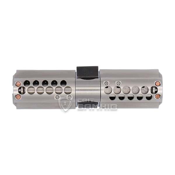 В корпусе цилиндра вмонтированы стальные закаленные штифты. Они предохраняют от высверливания и фрезерования блокирующих пинов и опорных пружин. При попытке просверлить отверстие, сверло будет вести в сторону или оно сломается. Но мы все равно рекомендуем при установке на входной двери использовать врезную броненакладку, это усилит конструкцию и значительно усложнит любые манипуляции с цилиндром.