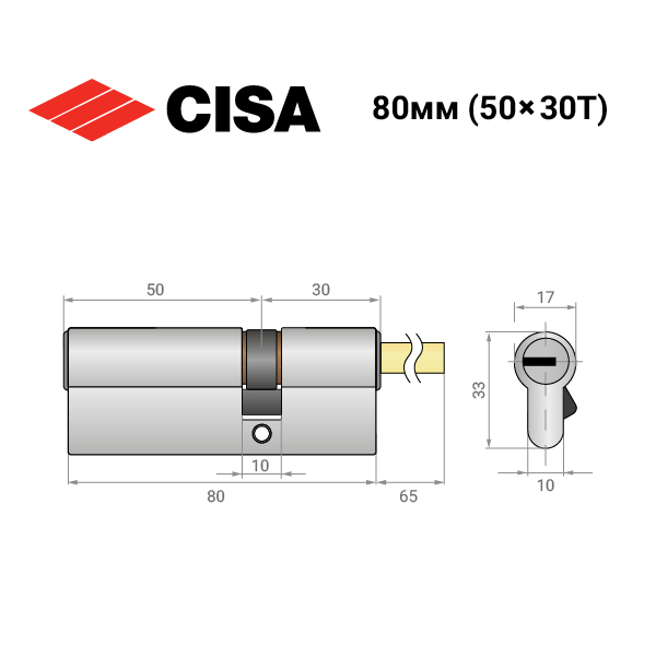 Описание Цилиндр CISA ASIX P8 PRO 80T (50*30T) со штоком никель матовый