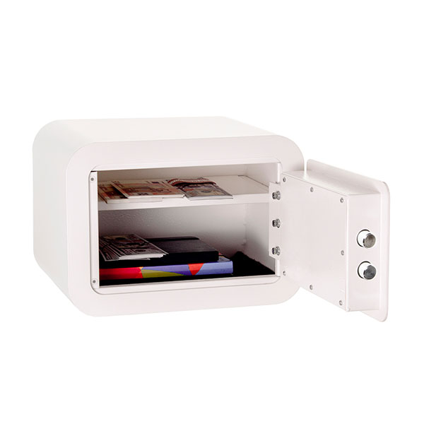Общие размеры составляют 250 мм по высоте, 350 мм по ширине и 280 мм по глубине. Такая компактность сейфа позволяет легко перемещать и перевозить его в другое место. Главной фишкой стал свежий инновационный дизайн с обтекаемыми углами в белом цвете. Благодаря нему, сейф выглядит стильно и не обыденно. Также в комплекте поставляется качественный коврик. Внутри есть съемная полка, которая позволит разделить пространство на несколько частей. Мы рекомендуем использовать данную модель для хранения печатей, денег, украшений, флешек, часов, небольших документов дома или в офисе.