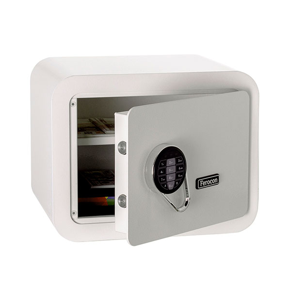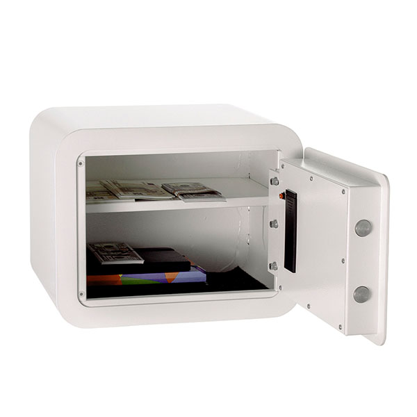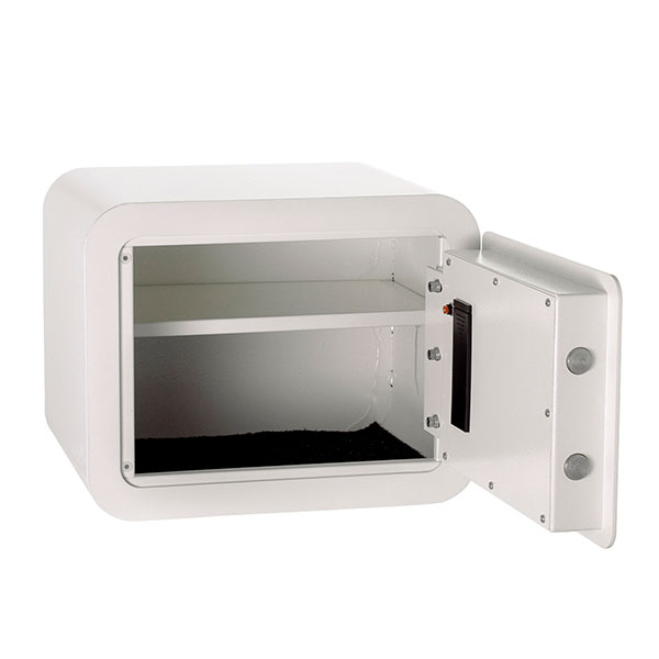 Корпус в виде сварной конструкции и двери сейфа изготовлены из стали. Их толщина составляет 1,5 мм и 4 мм соответственно. Сейф закрывается электронным кодовым замком, управляющим двумя ригелями. Для защиты от вандального взлома петли имеют внутреннее исполнение. В белом цвете он отлично дополнит современное помещение и не будет выделяться.