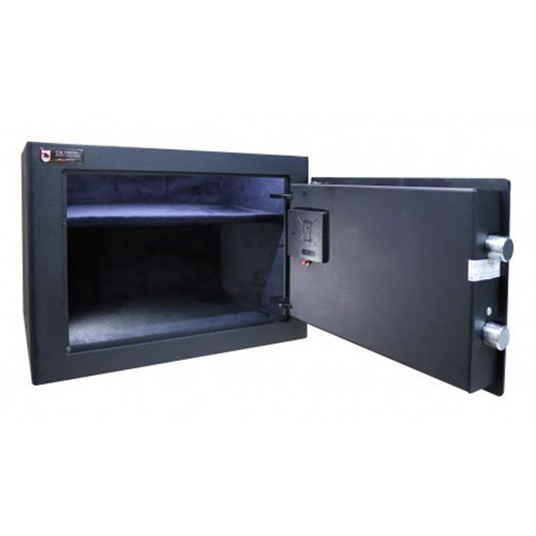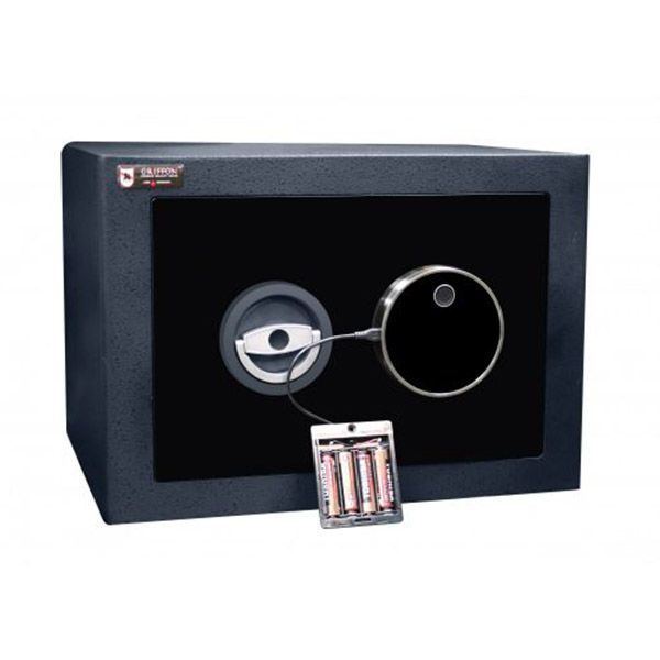 Корпус и двери сейфа изготовлены из металла толщиной 3 и 4 мм соответственно. Его особенностью является наличие биометрического замка. Он управляется отпечатком пальца или паролем. При необходимости можно установить двойной режим. Это обеспечивает более надежную защиту, поскольку нужно будет приложить палец и после этого еще ввести пароль. Можно добавить до 20 отпечатков пальцев. Пароль программируется с 6-12 цифр. Если три раза подряд ложный код или пять неверных отпечатков пальцев, то включится сигнал тревоги на 1 минуту. Его можно отключить только если ввести верный код или приложить правильный отпечаток. Также в данной модели присутствует Led-подсветка, которая включается автоматически при открывании. Запирание осуществляется толстыми вращающимися ригелями диаметром 25 мм. Они обеспечат практическую защиту от возможности их перепиливания. Петли в форме антисрезов имеют внутреннее исполнение, поэтому их сбить совершенно невозможно. Для комфортного пользования сейф изнутри покрыт велюром. В матовом черном цвете отлично дополнит любое помещение в современном или классическом стиле.