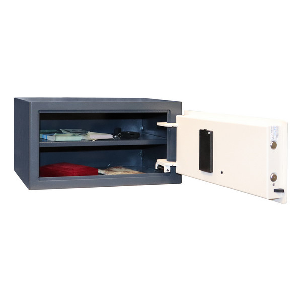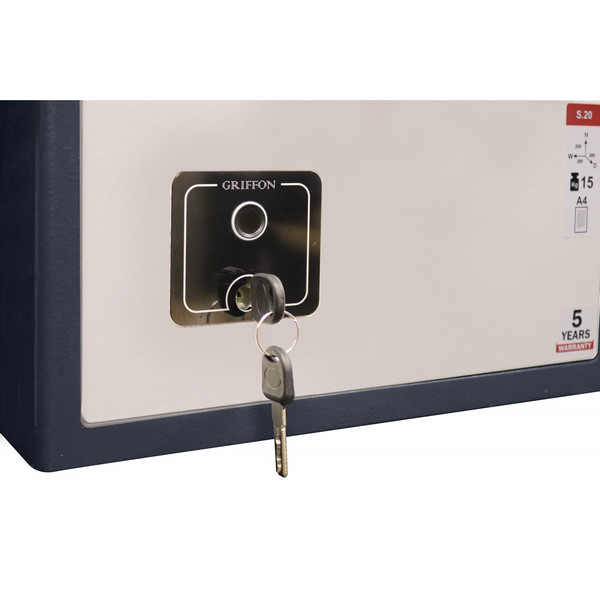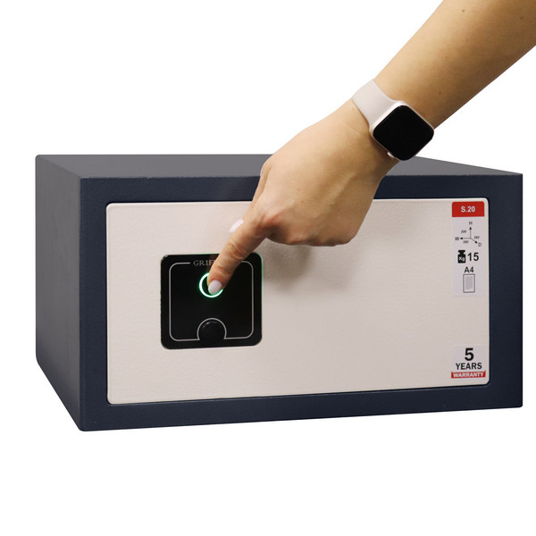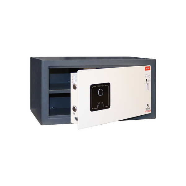 Корпус и двери сейфа изготовлены из металла толщиной 3 мм. Его особенностью является наличие биометрического замка GRIFFON.FP.LIGHT, который управляется отпечатком пальца. В случае непредвиденной ситуации имеется аварийный ключевой замок с двумя ключами с помощью которых можно открыть сейф без биометрики. Также есть возможность добавить до 32 отпечатков пальцев нажав на считыватель 4 раза, пока не загорится индикатор зеленым светом и не прозвучит длинный звуковой сигнал. Если ввести пять неверных отпечатков пальцев, то включится сигнал тревоги на 1 минуту. Его можно отключить только если приложить правильный отпечаток пальца.