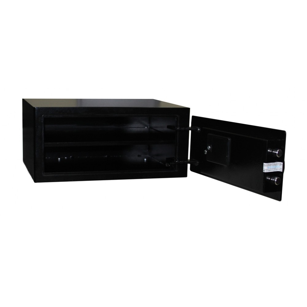Корпус и двери сейфа изготовлены из металла толщиной 3 мм. Закрывается электронным кодовым замком. Он оборудован дисплеем для отображения кода и ошибок. Как опция, возможна функция ведения журнала операций и система считывания данных. Особенностью этой модели является наличие ключевого замка. Он выступает в роли аварийного и применяется только для открывания в том случае, если Вы забыли код от электронного замка или не хотите его вводить. Запирание осуществляется ригелями диаметром 18 мм. В черном цвете отлично дополнит любое современное помещение.