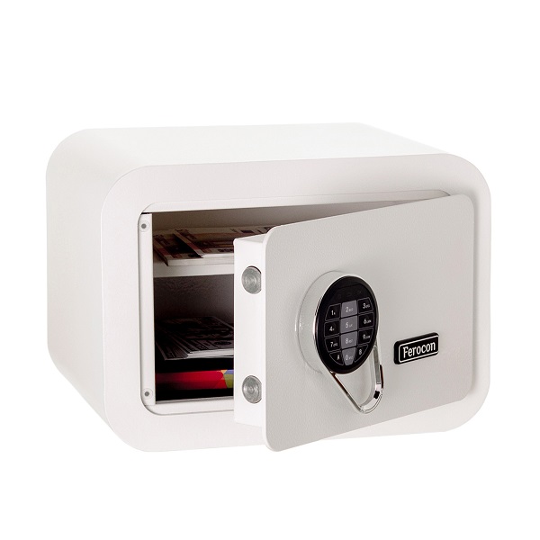 Корпус в виде сварной конструкции и двери сейфа изготовлены из стали. Их толщина составляет 1,5 мм и 4 мм соответственно. Сейф закрывается электронным замком, управляющим двумя ригелями. Для защиты от вандального взлома петли имеют внутреннее исполнение. В белом цвете он отлично дополнит современное помещение и не будет выделяться.