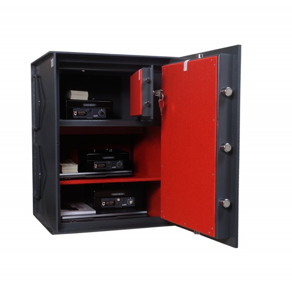 Внутреннее пространство имеет размеры: 588 мм по высоте, 440 мм по ширине и 302 мм по глубине. В нем присутствует полка, которая позволит горизонтально разделить общий объем на 2 части. Это удобно, когда нужно отделить, например, документы и деньги. Ее можно легко снять, если будет необходимость хранить более габаритные предметы. Дополнительно в этой модели есть отдельный кассовый отдел (трейзер), который можно закрыть на ключ. Он отлично подойдет для хранения небольших сумм денежных средств и других негабаритных ценностей. Фишкой данного сейфа является красная внутренняя отделка.
