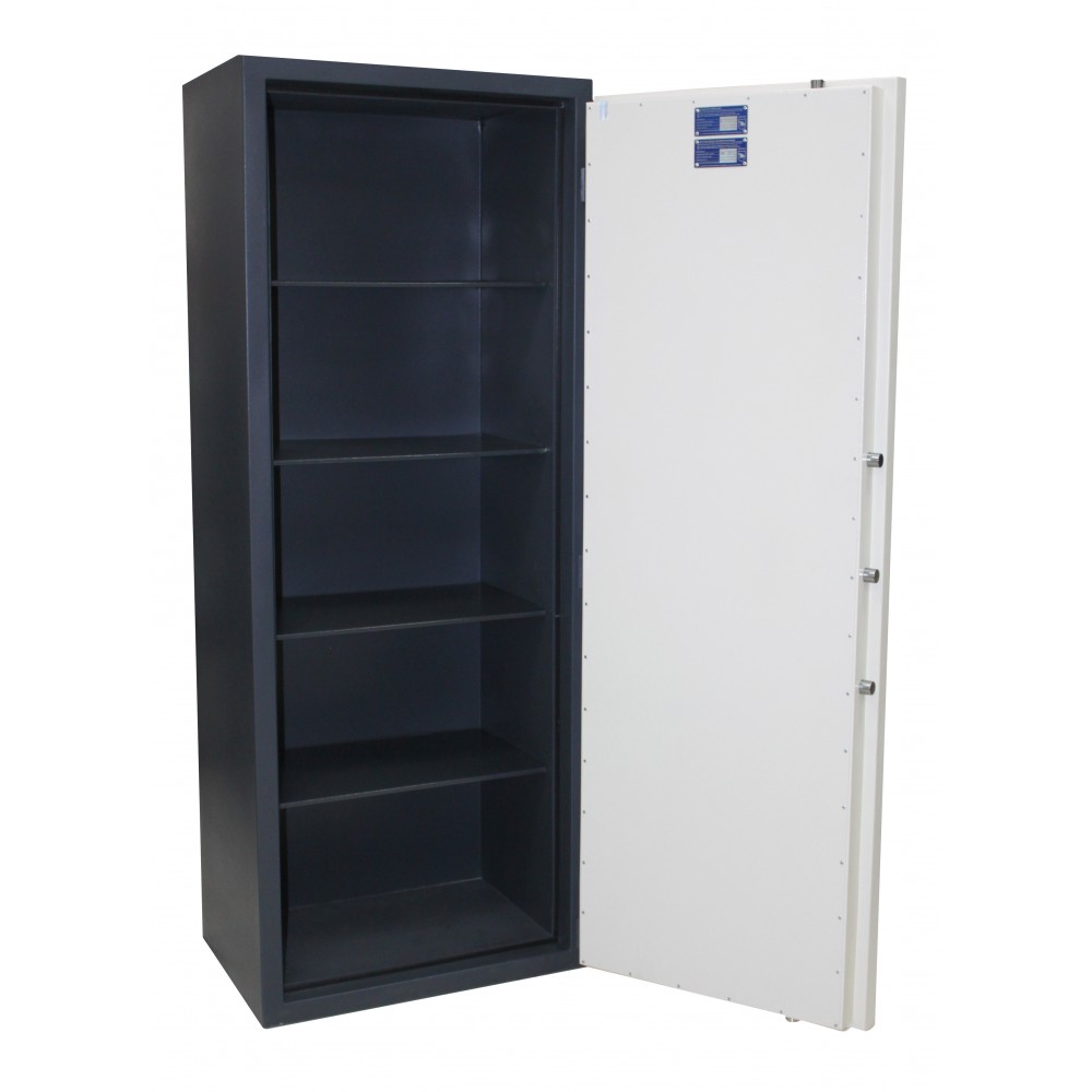Внутреннее пространство имеет размеры: 1688 мм по высоте, 604 мм по ширине и 353 мм по глубине. Есть 4 съемные полки, которые позволят разделить, например, документы и деньги. Их можно легко снять, если будет необходимость хранить объемные предметы. Внутри сейфа легко могут поместиться обычные папки с документами формата А4 в любом положении в несколько рядов.