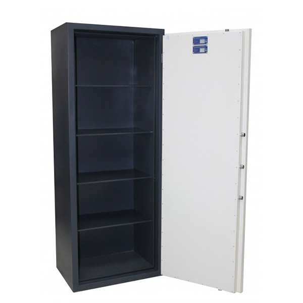 Внутреннее пространство имеет размеры: 1688 мм по высоте, 604 мм по ширине и 353 мм по глубине. Есть 4 съемные полки, которые позволят разделить большие объемы архивных документов и габаритных ценностей. Их можно легко снять, если будет необходимость хранить объемные предметы. Пространство внутри сейфа позволяет легко поместить обычные папки с документами формата А4 в 5 рядов.