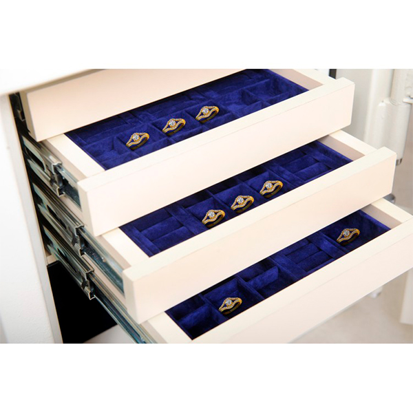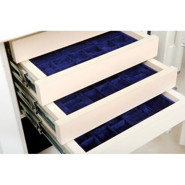Внутреннее пространство имеет размеры: 390 мм по высоте, 380 мм по ширине и 296 мм по глубине. Фишкой является наличие 4-х выдвижных ящиков для удобного хранения разного рода небольших украшений. Ниже есть отдел для хранения объемных вещей. Именно поэтому будет идеальным для использования в ювелирных мастерских.