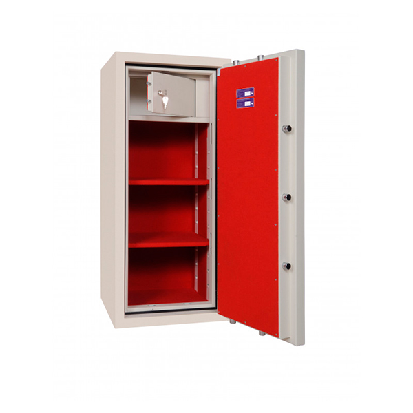 Корпус сейфа заполнен специальным фортификационным бетоном. Толщина защитного слоя составляет 40 мм. Закрывается ключевым сейфовым замком STUV и электронным кодовым замком M-LOCKS или STUV SWINGLOX, что создаст существенную преграду для злоумышленника. Запирание осуществляется ригельной системой трехстороннего действия. Толстые вращающиеся ригеля диаметром 25 мм обеспечат практическую защиту от возможности их перепиливания. Дополнительно со стороны петель является антисрезы. Удобства пользования добавляет эргономичная ручка. В кремовом цвете сейф отлично дополнит любое современное здание да не будет привлекать излишнее внимание.