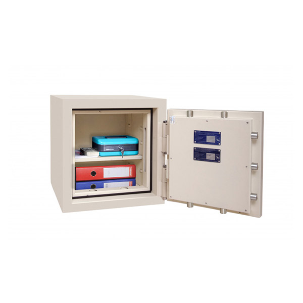 Корпус сейфа заполнен специальным фортификационным бетоном. Толщина защитного слоя составляет 40 мм. Вместе с механическим кодовым сейфовым замком это создаст существенную преграду для злоумышленника. Запирание осуществляется ригельной системой трехстороннего действия. Толстые вращающиеся ригеля диаметром 25 мм обеспечат практическую защиту от возможности их перепиливания. Дополнительно со стороны петель имеются антисрезы. В кремовом цвете сейф отлично дополнит любое современное помещение с подобными оттенками.