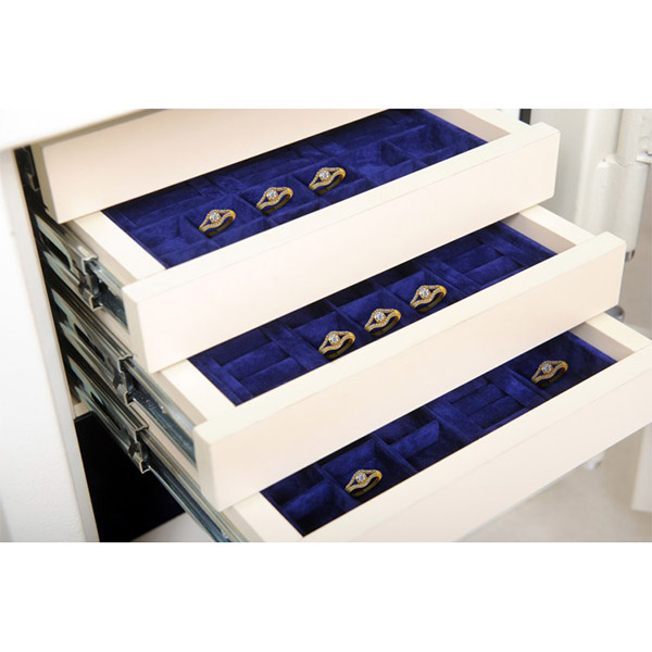 Внутреннее пространство имеет размеры: 390 мм по высоте, 380 мм по ширине и 296 мм по глубине. Фишкой является наличие 4-х выдвижных ящиков для удобного хранения разного рода небольших украшений. Именно поэтому будет идеальным для использования в ювелирных мастерских. Ниже есть отдел, который позволит поместить большего размера ценности. Объем внутри сейфа украшенный приятным материалом.