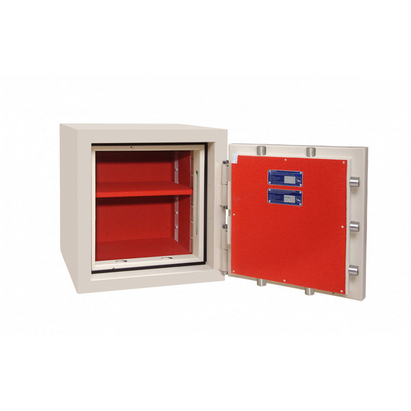Корпус сейфа заполнен специальным фортификационным бетоном. Толщина защитного слоя составляет 40 мм. Вместе с ключевым сейфовым замком STUV и электронным кодовым замком STUV SWINGLOX или M-LOCKS это создаст существенную преграду для злоумышленника. Запирание осуществляется ригельной системой трехстороннего действия. Толстые вращающиеся ригеля диаметром 25 мм обеспечат практическую защиту от возможности их перепиливания. Дополнительно со стороны петель имеются антисрезы. В кремовом цвете сейф отлично дополнит любое современное помещение с подобными оттенками.
