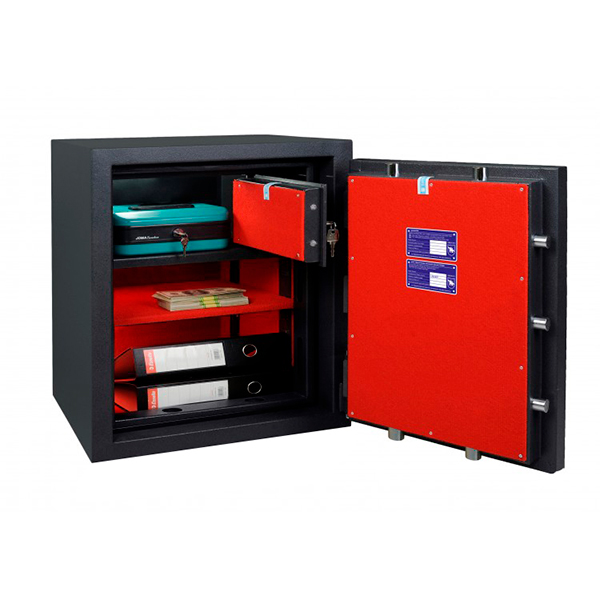 Внутреннее пространство имеет размеры 574 мм по высоте, 420 мм по ширине и 363 мм по глубине. Также есть полка, которая позволит разделить, например, документы и деньги. Ее можно легко снять, если будет необходимость хранить объемные предметы. Объем внутри сейфа украшенный приятным материалом и позволяет легко поместить обычные папки с документами формата А4 в любом положении. Дополнительно в этой модели есть отдельный кассовый отдел (трейзер).