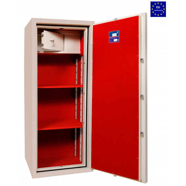 Корпус сейфа заполнен специальным фортификационным бетоном. Толщина защитного слоя составляет 55 мм. Закрывается ключевым сейфовым замком STUV и электронным кодовым замком M-LOCKS, что создаст существенную преграду для злоумышленника. Запирание осуществляется ригельной системой трехстороннего действия. Толстые вращающиеся ригеля диаметром 25 мм обеспечат практическую защиту от возможности их перепиливания. Дополнительно со стороны петель имеются антисрезы. В кремовом цвете сейф особенно удачно впишется в современное здание с подобными оттенками, где не будет особенно привлекать внимание.
