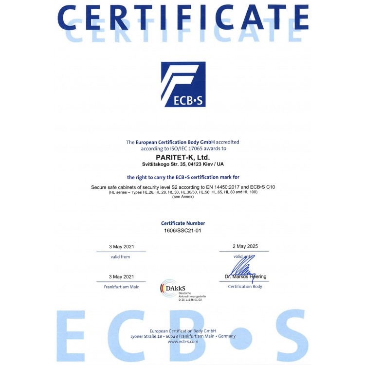Украинский производитель ПАРИТЕТ-К является одним из лучших и самых прогрессивных в сфере проектирования и изготовления сейфов любой категории. Данная модель GRIFFON CLE.II.150.Т.K.E относится к огневзломостойким. Она способна защищать ценности от взлома (II класс по EN 1143-1) и действия огня (класс LFS 30 P). Это означает, что во время пожара в течение 30 минут температура внутри сейфа не поднимется выше 170°C, чего достаточно для хранения бумажных документов. Довольно большие габариты потребуют немало места в помещении. Это нужно учитывать. Для надежности крепления внизу сейфа предусмотрены отверстия для анкерных болтов. Это позволит закрепить его к полу.