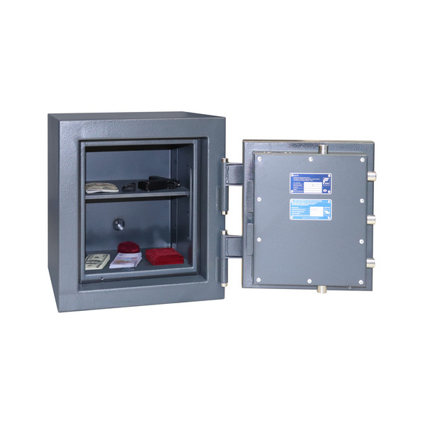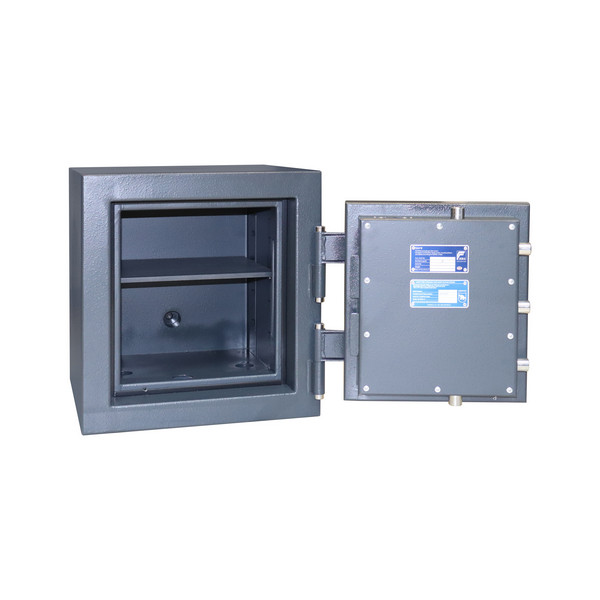 Корпус сейфа заполнен специальным фортификационным бетоном. Толщина защитного слоя составляет 55 мм. Вместе с ключевым сейфовым замком STUV это создаст существенную преграду и для злоумышленника. Запирание осуществляется ригельной системой трехстороннего действия. Толстые вращающиеся ригеля диаметром 25 мм обеспечат практическую защиту от возможности их перепиливания. Дополнительно со стороны петель является антисрезы. Удобства пользования добавляет эргономичная ручка. В темно-сером цвете с эффектом молотковой эмали сейф отлично дополнит любое современное здание да не будет привлекать излишнее внимание.