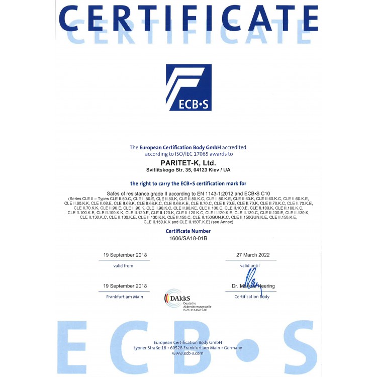 Украинский производитель ПАРИТЕТ-К является одним из лучших и самых прогрессивных в сфере проектирования и изготовления сейфов любой категории. Данная модель GRIFFON CLE.II.60 K.E CREAM относится к огневзломостойким. Она способна защищать ценности от взлома (II класс по EN 1143-1) и действия огня (класс LFS 30 P). Это означает, что во время пожара в течение 30 минут температура внутри сейфа не поднимется выше 170°C, чего достаточно для хранения бумажных документов. Относительно компактные размеры позволяют расположить сейф практически в любом месте в помещении. Для надежности крепления предусмотрены отверстия для анкерных болтов. Это позволит закрепить его к полу.