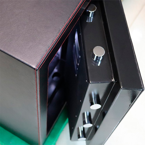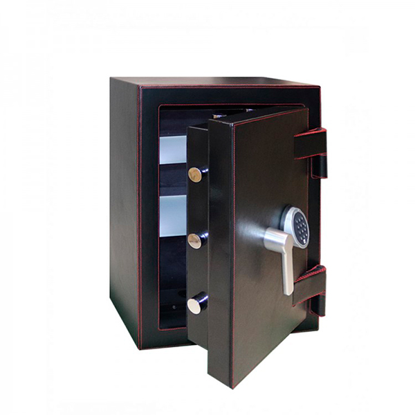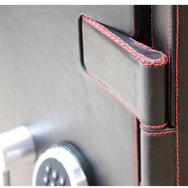 Корпус сейфа заполнен специальным фортификационным бетоном. Толщина защитного слоя составляет 55 мм. Вместе с электронным кодовым замком STUV SWINGLOX это создаст существенную преграду и для злоумышленника. Он оснащен светодиодной подсветкой синего цвета. Запирание осуществляется ригельной системой трехстороннего действия. Толстые вращающиеся ригеля диаметром 25 мм обеспечат практическую защиту от возможности их перепиливания. Дополнительно со стороны петель является антисрезы. Удобства пользования добавляет эргономичная ручка. Фишкой этого сейфа является отделка натуральной кожей. Это придаст особый статус его владельцу.