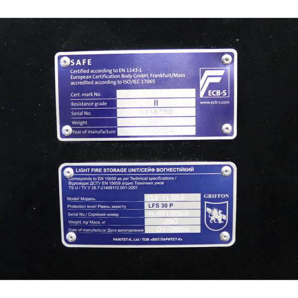 Данная модель GRIFFON CLE.II.68 E MAX BLACK относится к огневзломостойким сейфам, которая способна защищать ценности от взлома (II класс по EN 1143-1) и воздействия огня (класс LFS 30 P). Это означает, что во время пожара в течение 30 минут температура внутри сейфа не поднимется выше 170°C, чего достаточно для хранения бумажных документов. Для надежности крепления предусмотрены отверстия для анкерных винтов. Это позволит закрепить его к полу.