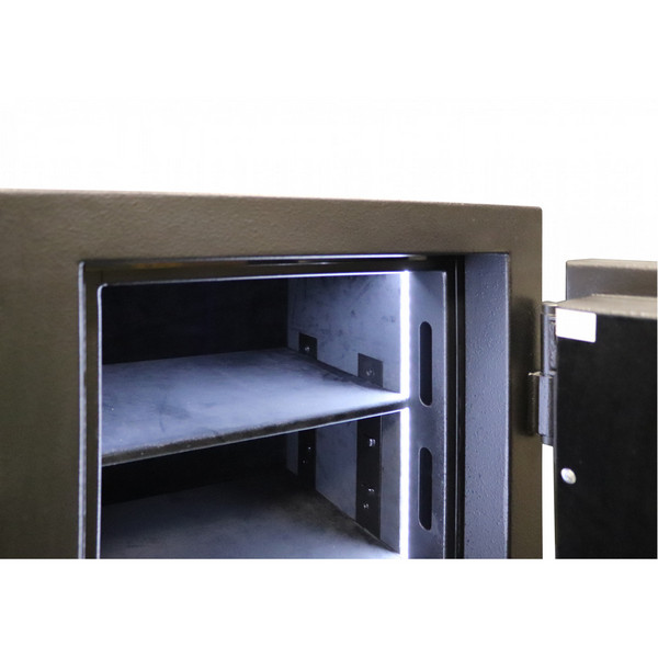 Внутреннее пространство имеет размеры: 570 мм по высоте, 390 мм по ширине и 330 мм по глубине. Есть две полки, которые позволяют разделить, например, документы и деньги. Их можно легко снять, если будет необходимость хранить объемные предметы. Пространство внутри сейфа позволяет легко поместить обычные папки с документами формата А4 в горизонтальном положении. Дополнительно в этой модели сейф оборудован подсветкой и внутренней отделкой из велюра. Это придаст дополнительного удобства при его пользовании.