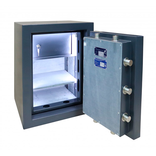 Корпус сейфа заполнен специальным фортификационным бетоном. Толщина защитного слоя составляет 55 мм.Вместе с электронным кодовым замком CARL WITTKOPP это создаст существенную преграду и для злоумышленника. Он оснащен светодиодной подсветкой синего цвета. Запирание осуществляется ригельной системой трехстороннего действия. Толстые вращающиеся ригеля диаметром 25 мм обеспечат практическую защиту от возможности их перепиливания. Дополнительно со стороны петель является антисрезы. Удобства пользования добавляет эргономичная ручка. В темно-сером цвете с эффектом молотковой эмали сейф отлично дополнит любое современное здание да не будет привлекать излишнее внимание.