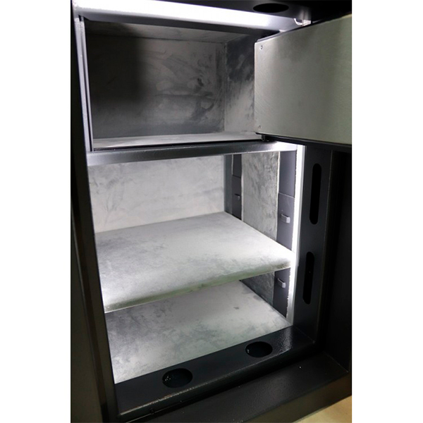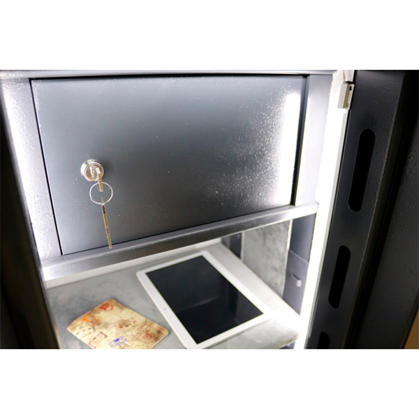 Внутреннее пространство имеет размеры: 570 мм по высоте, 390 мм по ширине и 330 мм по глубине. Есть полка, которая позволит разделить, например, документы и деньги. Ее можно легко снять, если будет необходимость хранить объемные предметы. Пространство внутри сейфа позволяет легко поместить обычные папки с документами формата А4 в горизонтальном положении. Дополнительно в этой модели есть отдельный кассовый отдел (трейзер). Он закрывается на ключ. Кроме того, сейф оборудован подсветкой и внутренней отделкой с велюра. Это добавит дополнительного удобства при его использовании.
