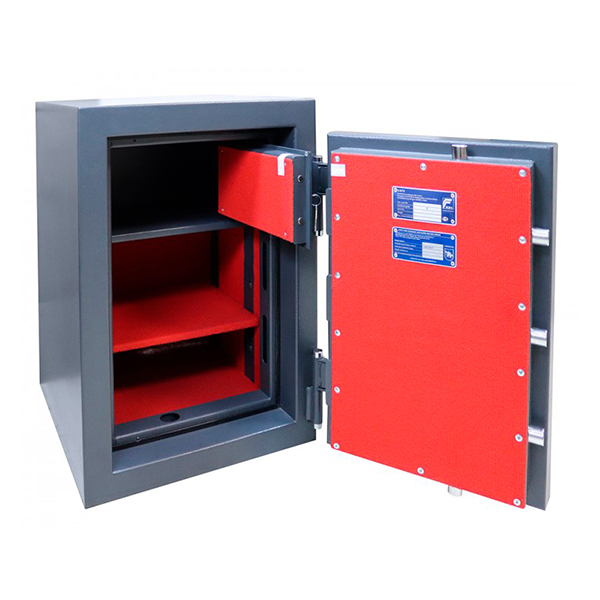 Внутреннее пространство имеет размеры: 570 мм по высоте, 390 мм по ширине и 330 мм по глубине. Есть полка, которая позволит разделить, например, документы и деньги. Ее можно легко снять, если будет необходимость хранить объемные предметы. Пространство внутри сейфа позволяет легко поместить обычные папки с документами формата А4 в горизонтальном положении. Дополнительно в этой модели есть отдельный кассовый отдел (трейзер). Он закрывается на ключ.