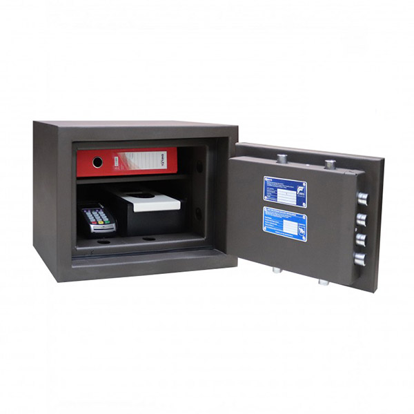 Внутреннее пространство имеет размеры 270 мм по высоте, 380 мм по ширине и 290 мм по глубине. Есть полка, которая позволит разделить, например, документы и деньги. Ее можно легко снять, если будет необходимость хранить объемные предметы. Пространство внутри сейфа позволяет легко поместить обычные папки с документами формата А4.