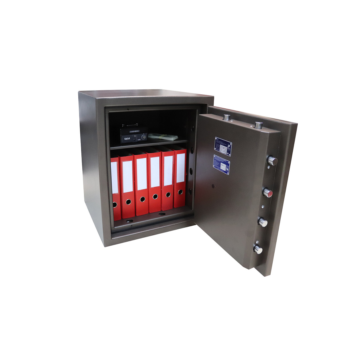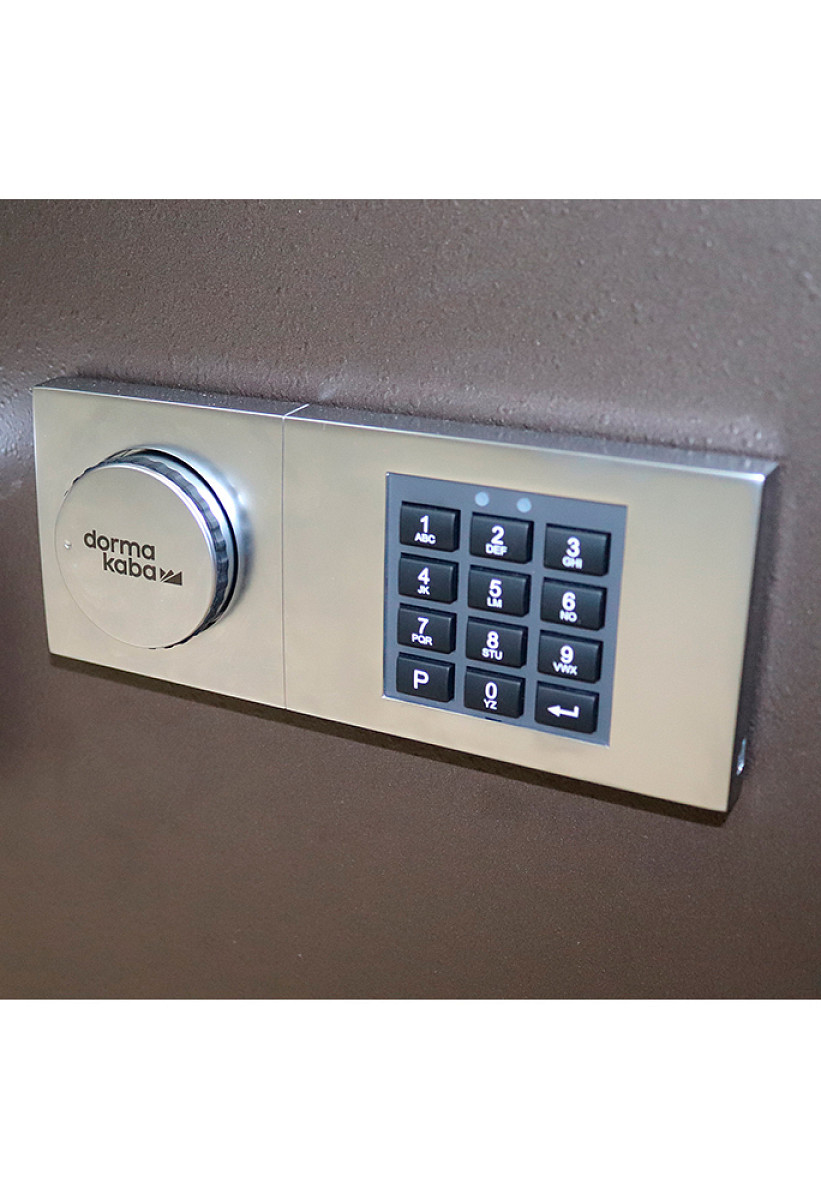 Внутренний корпус изготовлен из нержавеющей стали. Его стенки заполнены фортификационным бетоном толщиной 50 мм. Стальные легированные пластины защитят от высверливания и выбивания замков и ригелей. Вместе с электронным кодовым замком Kaba Combi это создаст существенную преграду и для злоумышленника. Его особенностью является аварийный двухбитный ключ. Им, предварительно открыв скрытую замочную скважину, можно открыть замок. Запирание осуществляется ригельной системой трехстороннего действия. Толстые вращающиеся ригеля диаметром 25 мм обеспечат практическую защиту от возможности их перепиливания. Дополнительно со стороны петель имеются антисрезы. Удобства пользования добавляет эргономичная ручка. В коричневом цвете сейф отлично дополнит любое современное здание да не будет привлекать излишнее внимание.