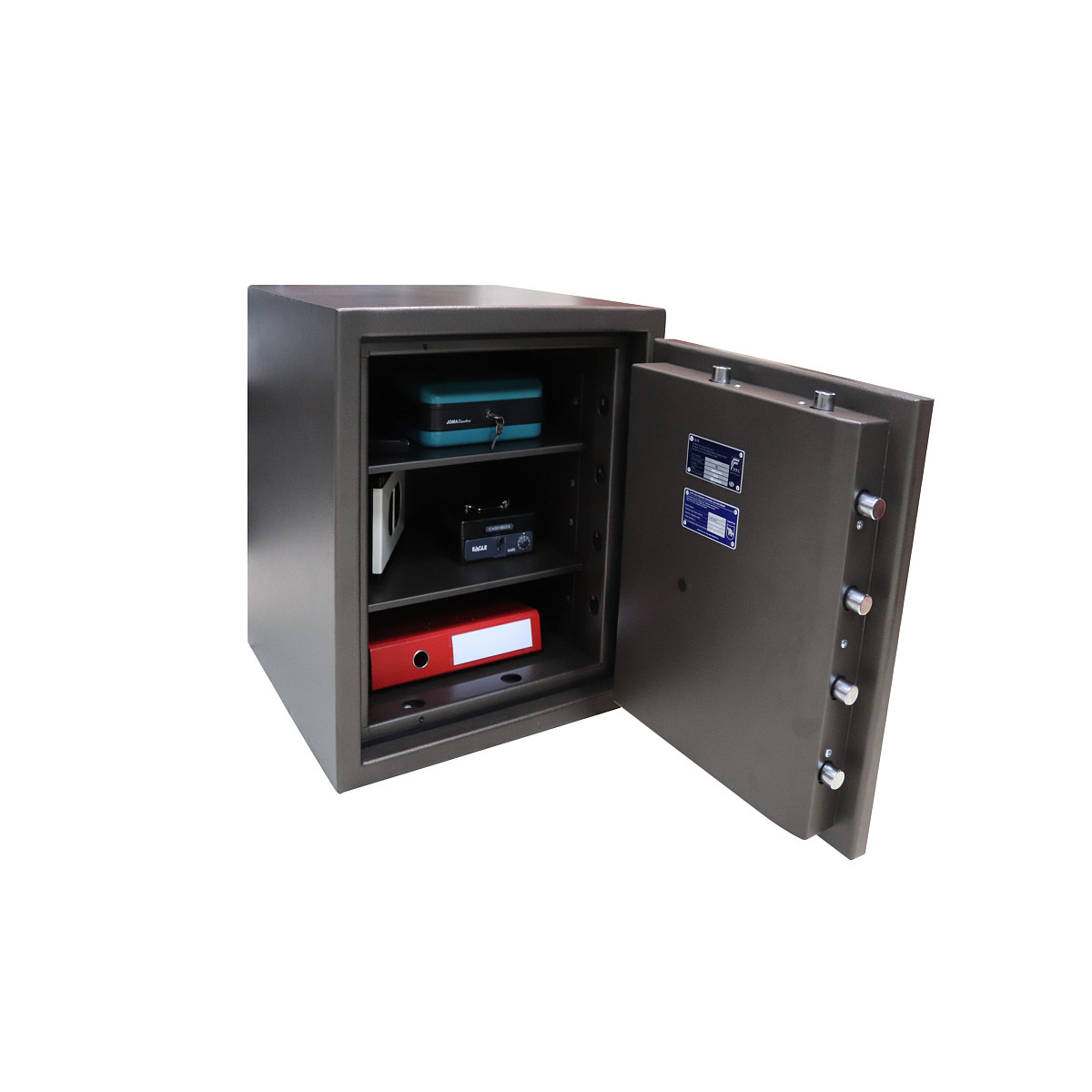 Внутреннее пространство имеет размеры 550 мм по высоте, 450 мм по ширине и 390 мм по глубине. Есть 2 полки, которые позволят разделить, например, документы и деньги. Их можно легко снять, если будет необходимость хранить объемные предметы. Пространство внутри сейфа позволяет легко поместить обычные папки с документами формата А4 в несколько рядов.