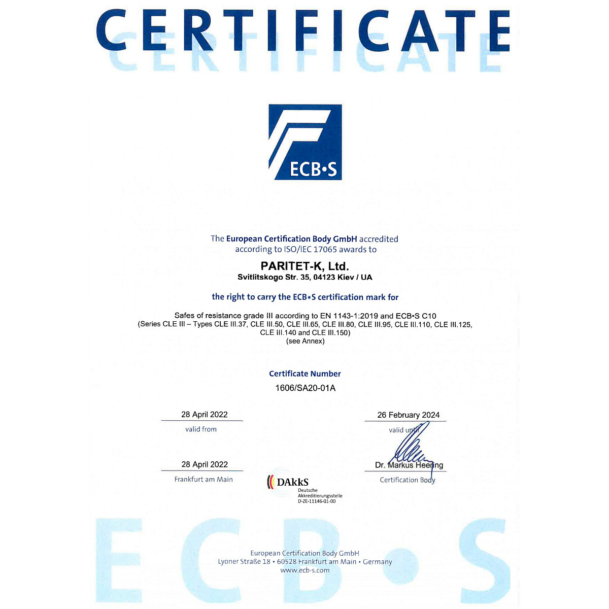 Украинский производитель ПАРИТЕТ-К является одним из лучших и самых прогрессивных в сфере проектирования и изготовления сейфов любой категории. Данная модель GRIFFON CLE III.65 .K.E относится к взломоустойчивым. Она сертифицирована Европейским органом сертификации ECB-S по II и класса сопротивления к взлому по стандарту EN 1143-1. Относительно компактные размеры позволяют расположить сейф практически в любом месте в помещении. Для надежности крепления предусмотрены отверстия для анкерных болтов. Это позволит закрепить его к полу.