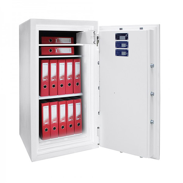 Корпус и двери сейфа заполнены специальным огнестойким бетоном. Толщина защитного слоя составляет 72 мм. Вместе с электронным кодовым замком M-LOCKS это создаст существенную преграду для злоумышленника. Запирание осуществляется ригельной системой четырехсторонней действия. Толстые вращающиеся ригеля диаметром 25 мм обеспечат практическую защиту от возможности их перепиливание. В белом цвете сейф отлично дополнит любое современное здание и не будет выделяться.