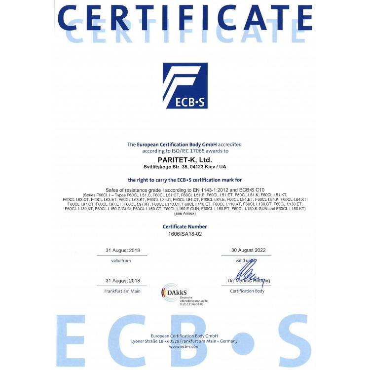 Украинский производитель ПАРИТЕТ-К является одним из лучших и самых прогрессивных в сфере проектирования и изготовления сейфов любой категории. Данная модель GRIFFON F60CL I.150 E GUN из серии F60CL относится к огневзломостойким. Она способна защищать ценности от взлома (первый класс) и действия огня (класс LFS 60 P). Это означает устойчивость сейфа к воздействию температуры 170°C в течении 60 минут. Основное назначение - хранение оружия с максимальной высотой 1350 мм. Довольно большие габариты потребуют немало места в помещении. Это нужно учитывать. Для надежности крепления внизу сейфа предусмотрены отверстия для анкерных болтов. Это позволит закрепить его к полу.