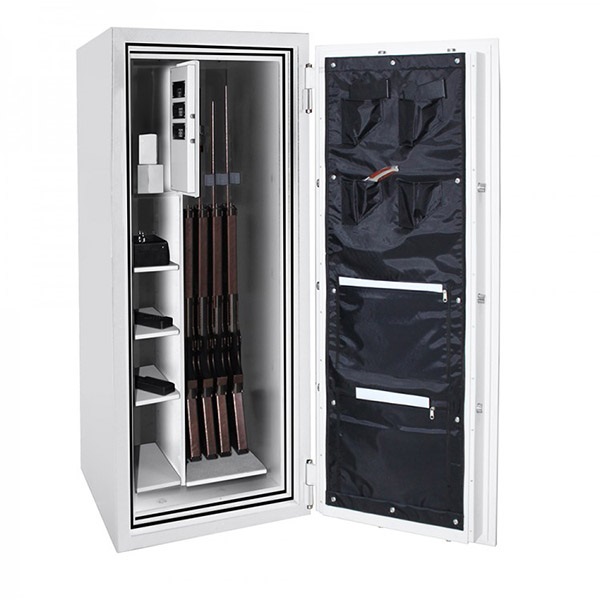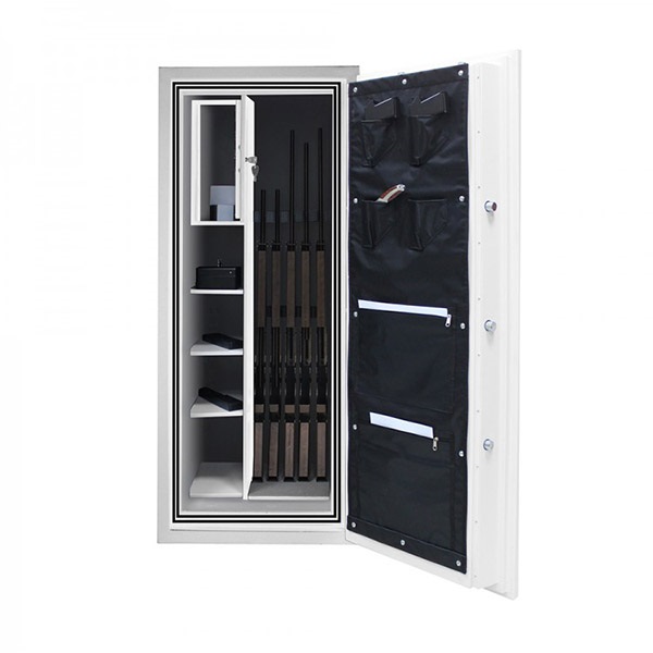 Внутреннее пространство имеет размеры: 1376 мм по высоте, 506 мм по ширине и 438 мм по глубине. Также есть 3 полки. Их можно легко снять, если будет необходимость хранить объемные предметы. Кроме того, пространство внутри сейфа включает передвижные магнитные ложементы, которые могут устанавливаться на любую удобную высоту и органайзер на дверях. Дополнительно в этой модели есть отдельный кассовый отдел (трейзер), который можно использовать для хранения патронов. Он закрывается на ключ.