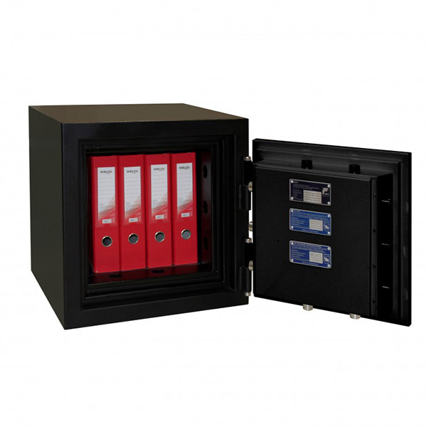 Корпус и двери сейфа заполнены специальным огнестойким бетоном. Толщина защитного слоя составляет 72 мм. Вместе с ключевым сейфовым замком STUV это создаст существенную преграду для злоумышленника. Запирание осуществляется ригельной системой четырехстороннего действия. Толстые вращающиеся ригеля диаметром 25 мм обеспечат практическую защиту от возможности их перепиливания. В черном цвете сейф отлично дополнит любое современное помещение и не будет выделяться.