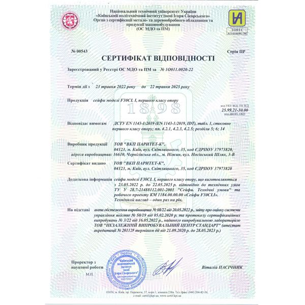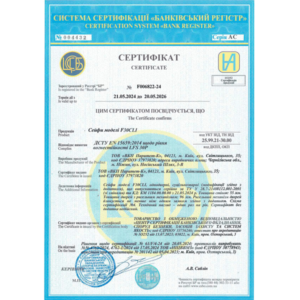 Украинский производитель ПАРИТЕТ-К является одним из лучших и самых прогрессивных в сфере проектирования и изготовления сейфов любой категории. Данная модель GRIFFON F30CL I.50.C относится к огневзломостойким. Она способна защищать ценности от взлома (I класс по EN 1143-1) и действия огня (класс LFS 30 P). Это означает, что во время пожара в течение 30 минут температура внутри сейфа не поднимется выше 170°C, чего достаточно для хранения бумажных документов. Относительно компактные размеры позволяют расположить сейф практически в любом месте в помещении. Для надежности крепления предусмотрены отверстия для анкерных болтов. Это позволит закрепить его к полу.