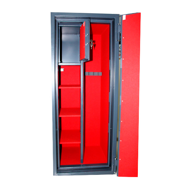 Внутреннее пространство имеет размеры: 1410 мм по высоте, 520 мм по ширине и 456 мм по глубине. Имеет 3 полки, которые позволят разделить, например, документы и ценности. Их можно легко снять, если будет необходимость хранить объемные предметы. Есть специальный ложемент для винтовок. Дополнительно в этой модели есть отдельный кассовый отдел (трейзер), в котором можно хранить патроны. Он закрывается на ключ. Особенностью этой модели является красная внутренняя отделка.
