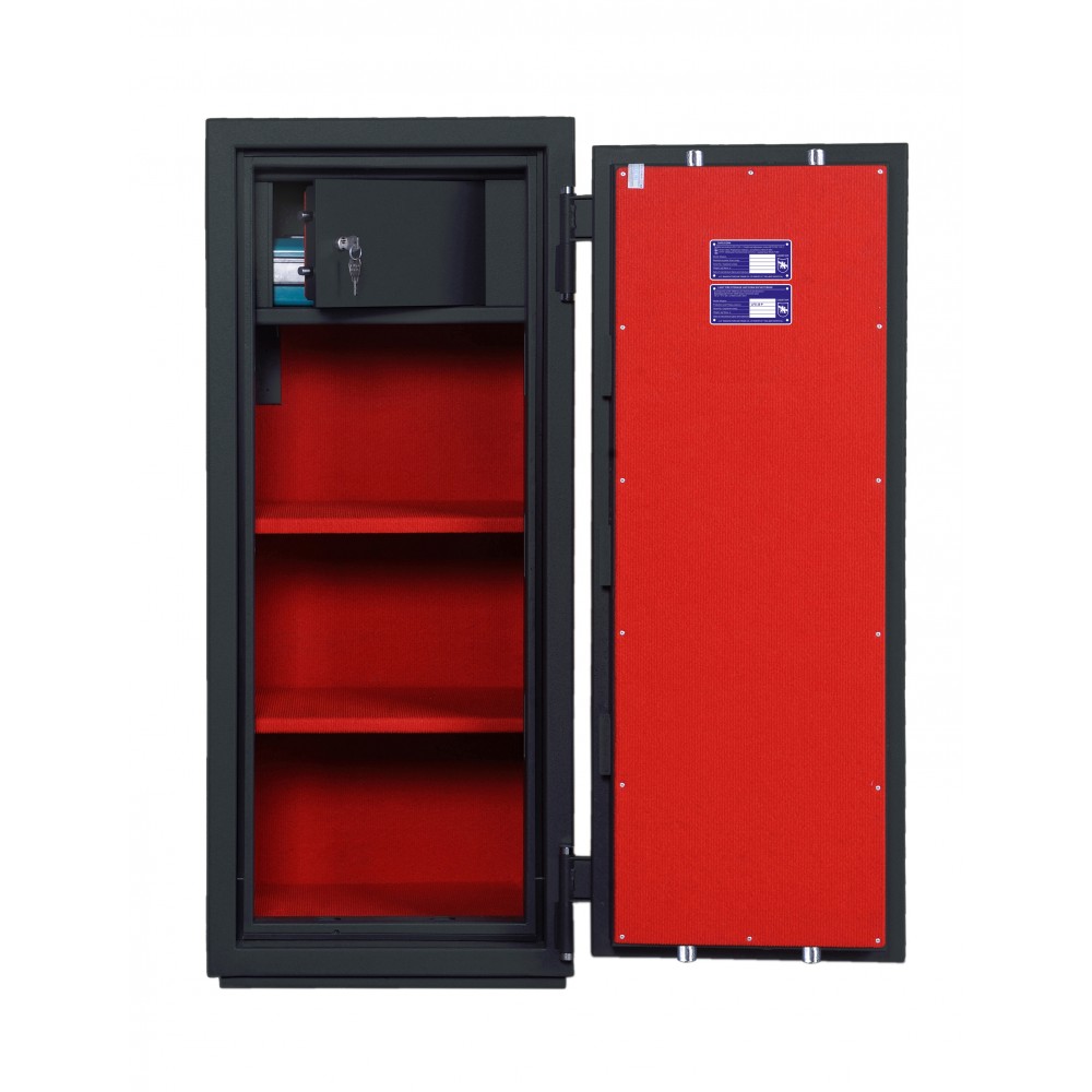 Внутреннее пространство имеет размеры: 1084 мм по высоте, 420 мм по ширине и 363 мм по глубине. Есть 2 полки, которые позволят разделить, например, документы и деньги. Их можно легко снять, если будет необходимость хранить объемные предметы. Пространство внутри сейфа позволяет легко поместить обычные папки с документами формата А4 в 2 ряда. Дополнительно в этой модели есть отдельный кассовый отдел (трейзер). Он закрывается на ключ.
