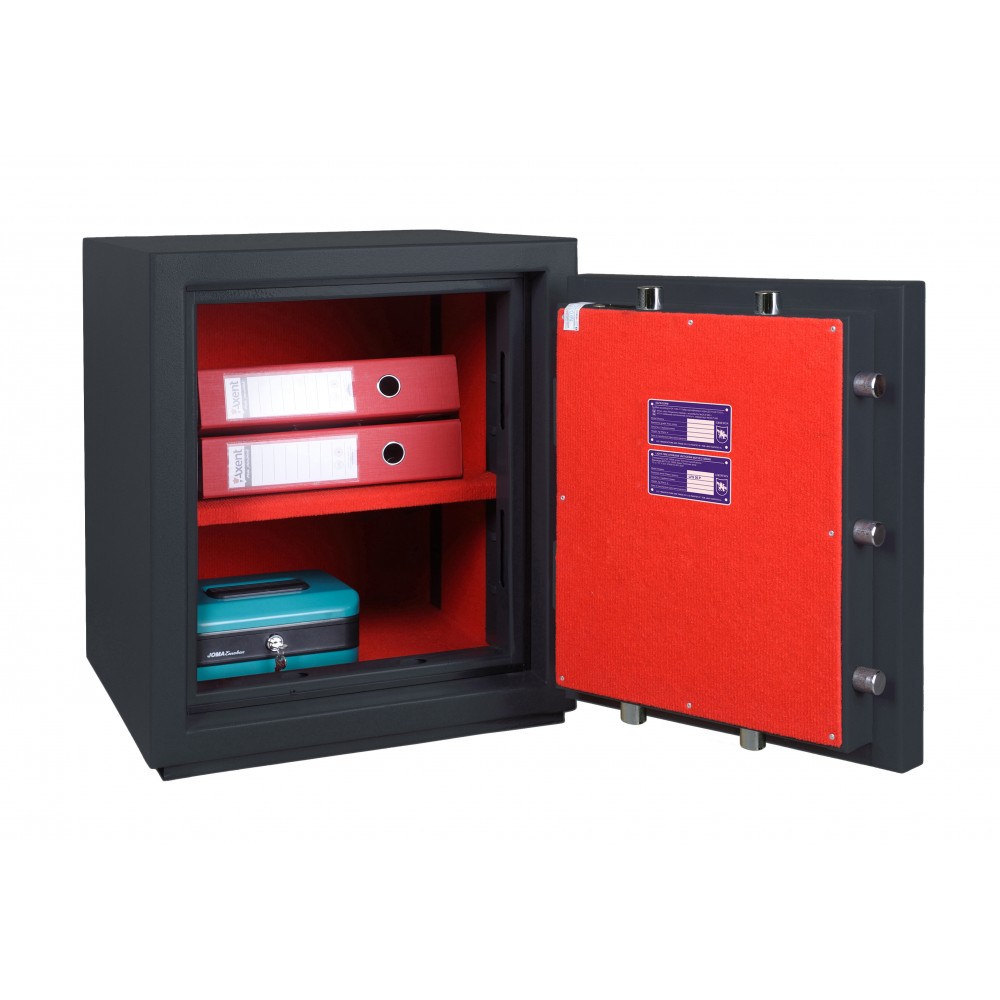Внутреннее пространство имеет размеры: 502 мм по высоте, 420 мм по ширине и 363 мм по глубине. Есть полка, которая позволит разделить, например, документы и деньги. Ее можно легко снять, если будет необходимость хранить объемные предметы. Пространство внутри сейфа позволяет легко поместить обычные папки с документами формата А4 в любом положении.