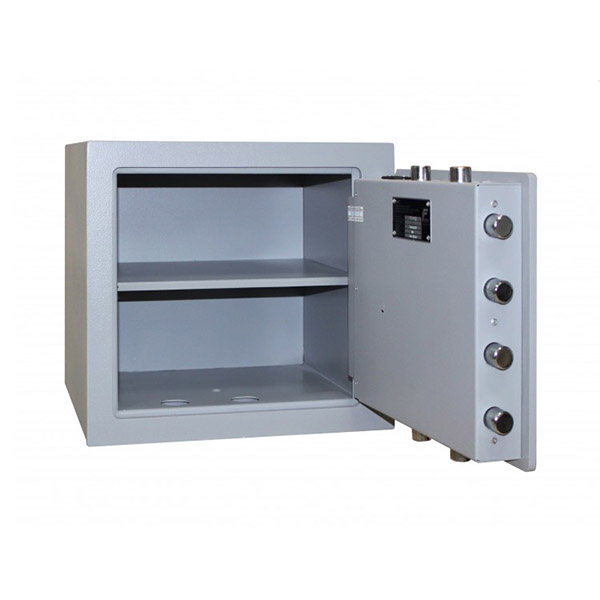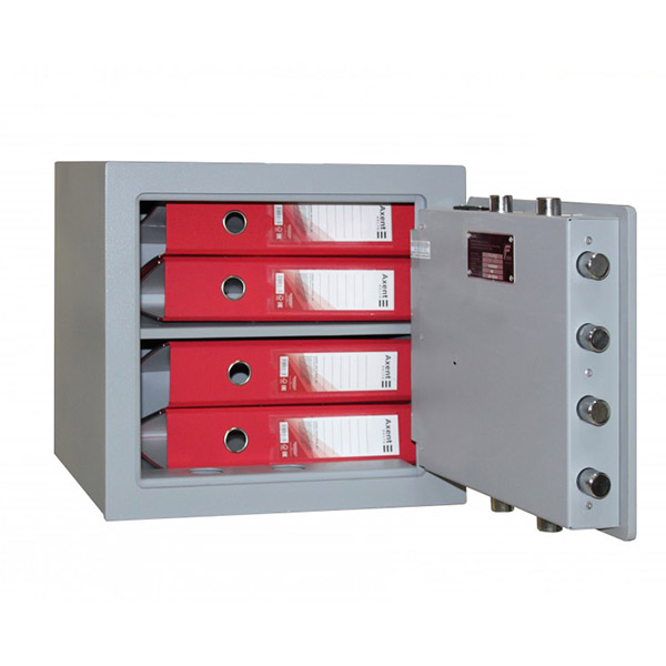 Стенки корпуса данного сейфа заполнены фортификационным бетоном толщиной 25 мм. Двери изготовлены из металла толщиной 10 мм. Стальные легированные пластины защитят от высверливания и выбивания замков и ригелей. Вместе с ключевым сейфовым замком STUV это создаст существенную преграду для злоумышленника. Запирание осуществляется ригельной системой трехстороннего действия. Толстые вращающиеся ригеля диаметром 25 мм обеспечат практическую защиту от возможности их перепиливания. Дополнительно со стороны петель имеются антисрезы. Удобства пользования добавляет эргономичная ручка. В сером цвете сейф отлично дополнит любое современное помещение и не будет привлекать излишнего внимания.