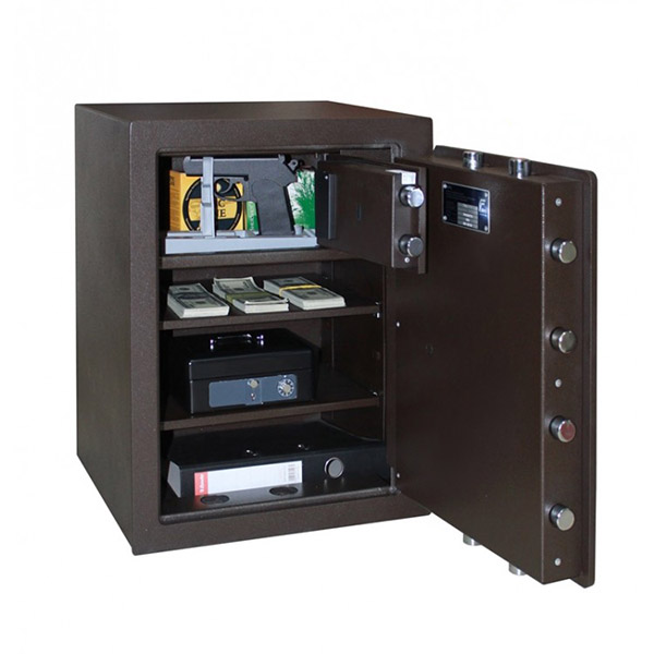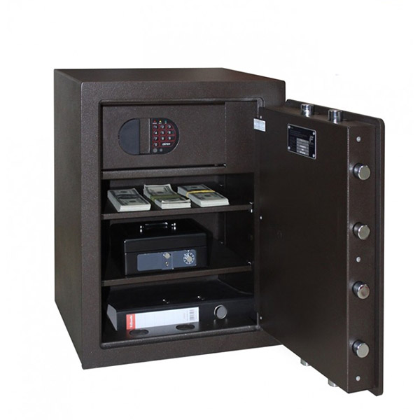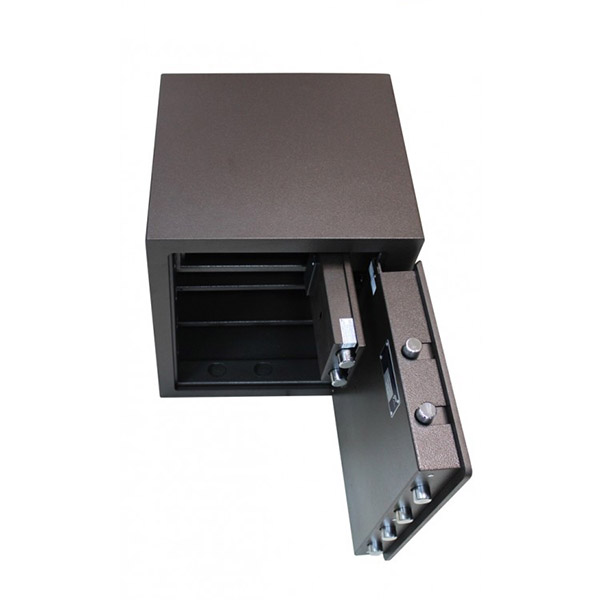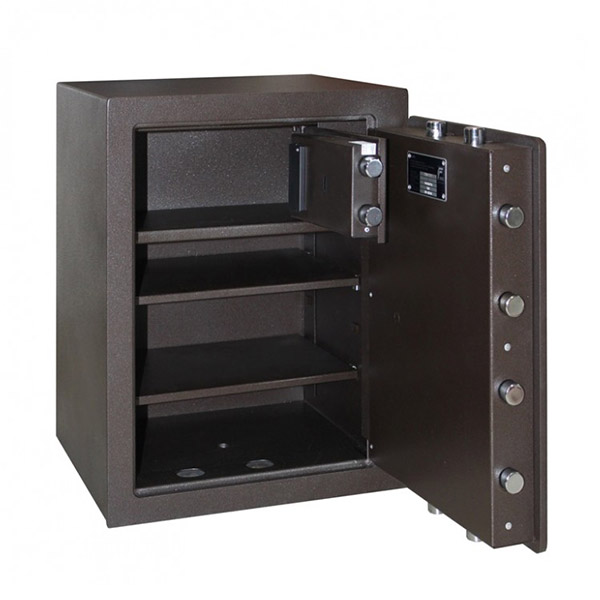 Стенки корпуса данного сейфа заполнены фортификационным бетоном толщиной 25 мм. Двери изготовлены из металла толщиной 10 мм. Стальные легированные пластины защитят от высверливания и выбивания замков и ригелей. Вместе с электронным кодовым замком STUV SWINGLOX или M-LOCKS это создаст существенную преграду для злоумышленника. Запирание осуществляется ригельной системой трехстороннего действия. Толстые вращающиеся ригеля диаметром 25 мм обеспечат практическую защиту от возможности их перепиливания. Дополнительно со стороны петель имеются антисрезы. Удобства пользования добавляет эргономичная ручка. В коричневом цвете сейф отлично дополнит любое современное помещение и не будет привлекать излишнего внимания.