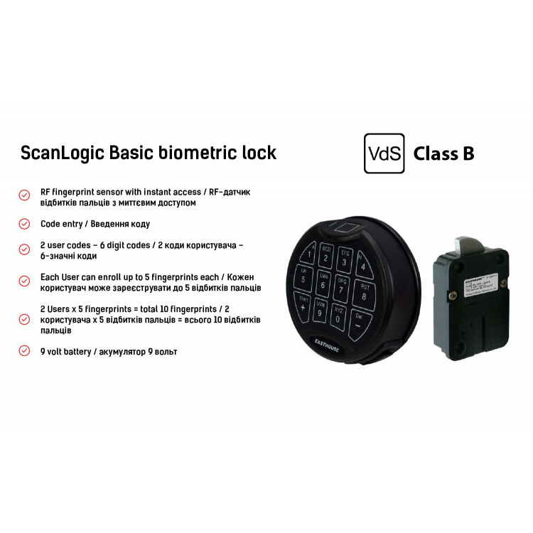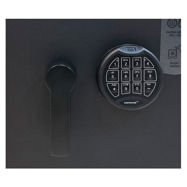 Стенки корпуса данного сейфа заполнены бетоном фортификационным толщиной 25 мм. Дверь изготовлена из металла толщиной 10 мм. Стальные легированные пластины оградят от высверливания и выбивания замков и ригелей. Особенностью сейфа есть наличие биометрического замка Easthouse. Он управляется отпечатком пальца или паролем. Можно добавить до 10 отпечатков пальцев (2 пользователя по 5). Пароль программируется из 6 цифр. Замыкание производится ригельной системой трехстороннего действия. Толстые вращающиеся ригеля диаметром 25 мм обеспечат практическую защиту от возможности их перепиливания. Дополнительно со стороны петель есть антисрезы. Удобства использования добавляет эргономичная ручка. В черном цвете сейф отлично дополнит любое современное помещение и не будет привлекать излишнее внимание.