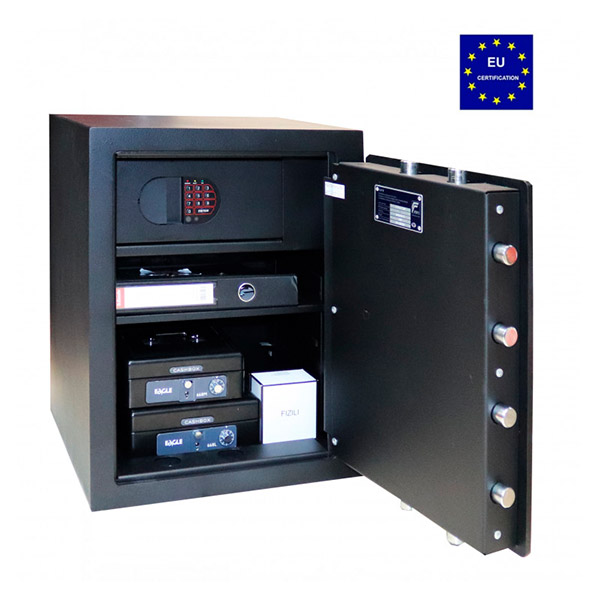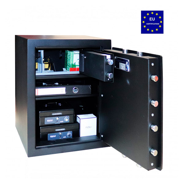 Внутреннее место имеет размеры: 500 мм по высоте, 385 мм по ширине и 300 мм по глубине. Есть полка, которая позволит разделить, например, документы и деньги. Её можно легко снять, если необходимо хранить объемные предметы. Пространство внутри сейфа позволяет легко поместить обычные папки с документами формата А4 в 3 ряда. Дополнительно у этой модели есть отдельный кассовый отдел (трейзер). Он отдельно закрывается электронным кодовым замком. Мы рекомендуем использовать данную модель для хранения денег, важных документов и других ценностей.