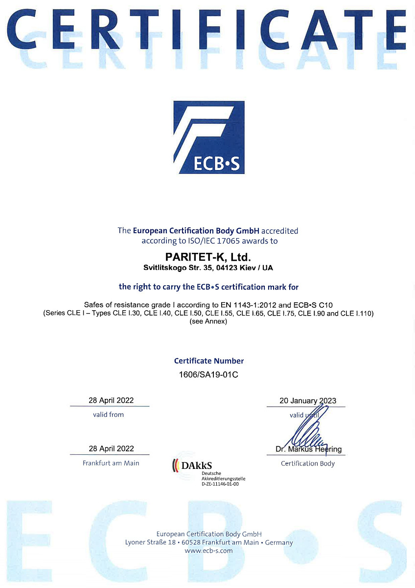 Украинский производитель ПАРИТЕТ-К является одним из лучших и самых прогрессивных в сфере проектирования и изготовления сейфов любой категории. Данная модель GRIFFON CLE I.55.FP относится к взломостойким. Она сертифицирована по I классу сопротивления к взлому по стандарту EN 1143-1. Для надежности крепления предусмотрены отверстия для анкерных болтов. Это позволит закрепить сейф к полу.