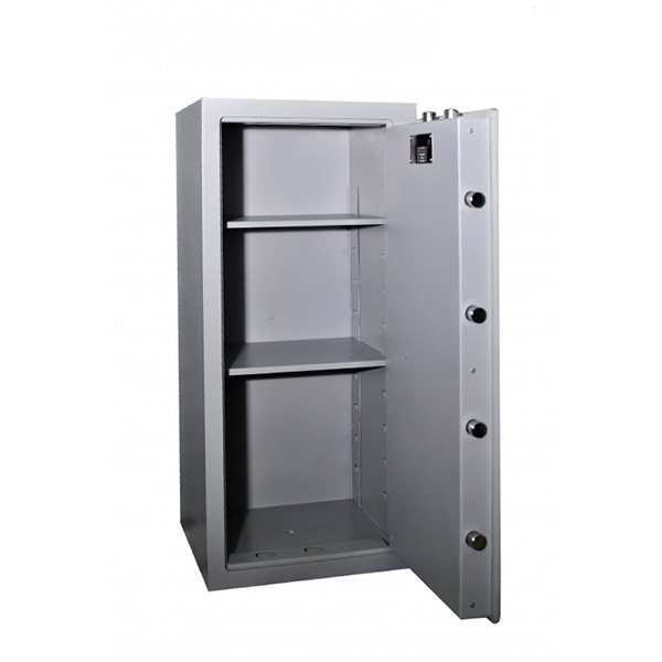 Стенки корпуса данного сейфа заполнены фортификационным бетоном толщиной 25 мм. Двери изготовлены из металла толщиной 10 мм. Стальные легированные пластины защитят от высверливания и выбивания замков и ригелей. Вместе с ключевым сейфовым замком STUV это создаст существенную преграду для злоумышленника. Запирание осуществляется ригельной системой трехстороннего действия. Толстые вращающиеся ригеля диаметром 25 мм обеспечат практическую защиту от возможности их перепиливания. Дополнительно со стороны петель имеются антисрезы. Удобства пользования добавляет эргономичная ручка. В сером цвете сейф отлично дополнит любое современное помещение и не будет привлекать излишнего внимания.