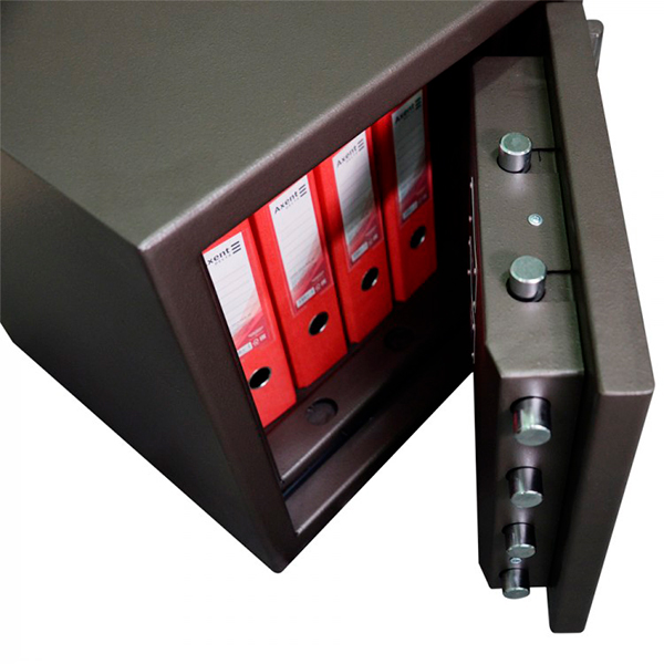 Внутреннее пространство имеет размеры: 400 мм по высоте, 380 мм по ширине и 290 мм по глубине. Есть полка, которая позволит разделить, например, документы и деньги. Ее можно легко снять, если будет необходимость хранить объемные предметы. Объем внутри сейфа позволяет легко поместить обычные папки с документами формата А4 в любом положении.