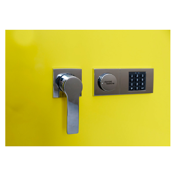 Внутренний корпус изготовлен из нержавеющей стали. Его стенки заполнены фортификационным бетоном толщиной 50 мм. Стальные легированные пластины защитят от высверливания и выбивания замков и ригелей. Вместе с электронным кодовым замком Kaba Combi это создаст существенную преграду для злоумышленника. Запирание осуществляется ригельной системой трехстороннего действия. Толстые вращающиеся ригеля диаметром 25 мм обеспечат практическую защиту от возможности их перепиливания. Дополнительно со стороны петель имеются антисрезы. Удобства пользования добавляет эргономичная ручка. Фишка сейфа - новый желтый глянцевый цвет. Он отлично дополнит любое современное помещение.