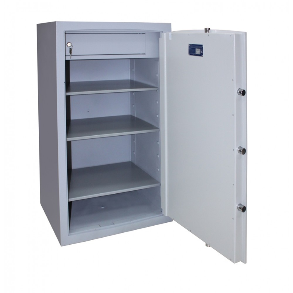 Внутреннее пространство имеет размеры: 949 мм по высоте, 550 мм по ширине и 418 мм по глубине. Есть 3 полки, которые позволят разделить, например, документы и деньги. Их можно легко снять, если будет необходимость хранить объемные предметы. Пространство внутри сейфа позволяет легко поместить обычные папки с документами формата А4 в 4 ряда.